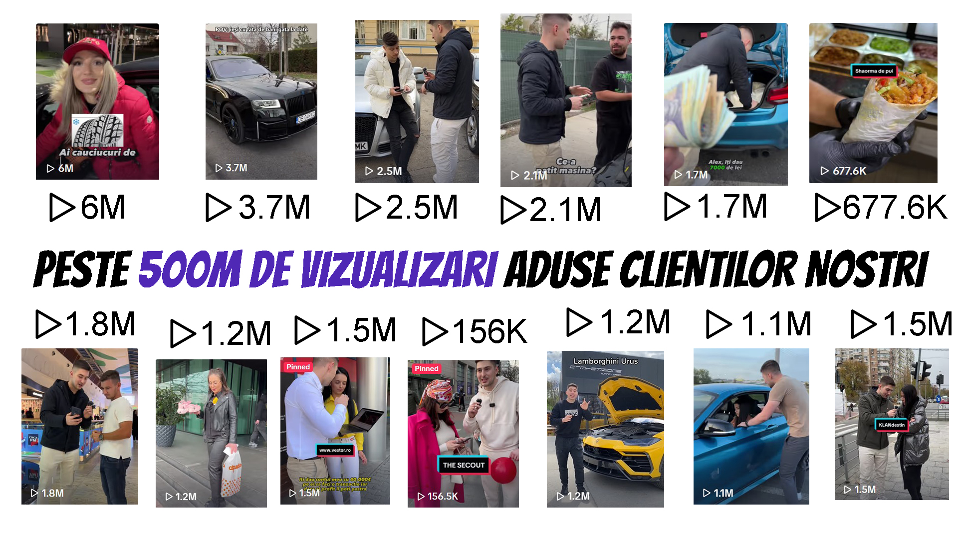 Am creat TikTok-uri care au acumulat peste 500 de milioane de vizualizări pe conturile clienților noștri. Acest succes remarcabil demonstrează expertiza noastră în generarea de conținut viral, captarea interesului publicului și amplificarea vizibilității brandurilor. Colaborând cu noi, veți beneficia de o strategie de marketing pe social media personalizată, adaptată nevoilor specifice ale afacerii dumneavoastră, pentru a atinge și depăși obiectivele de creștere și implicare.